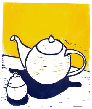 still life without cup linocut 13 x 16 cm two steps of cutting and printing in yellow and deep blue prints available | back | overview | home |